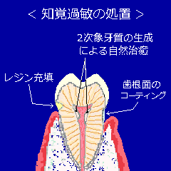 それからもう一つ、 ● 自然治癒力による2次象牙質の形成です。 これは、歯の神経のがまっとうに働いている状況で”一部に刺激が強く当たっている部分があると、その内部からヌリカベして象牙細管を遮断しようとする防御反応です(上図「2次象牙質の生成」)。 ※加齢によって根の中の神経のスペース(髄腔:ずいくう)が狭くなって行きますが、これは長年の温熱刺激で2次象牙質がどんどん作られていく為です | |